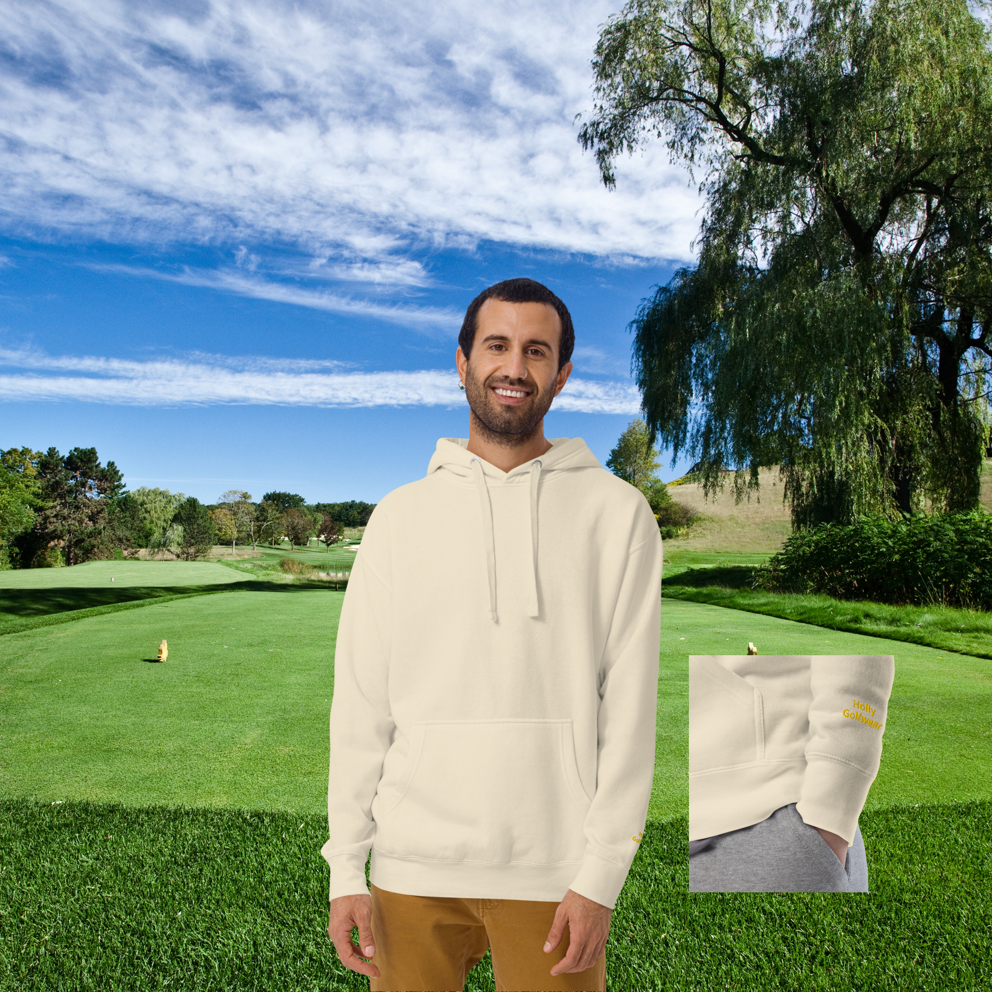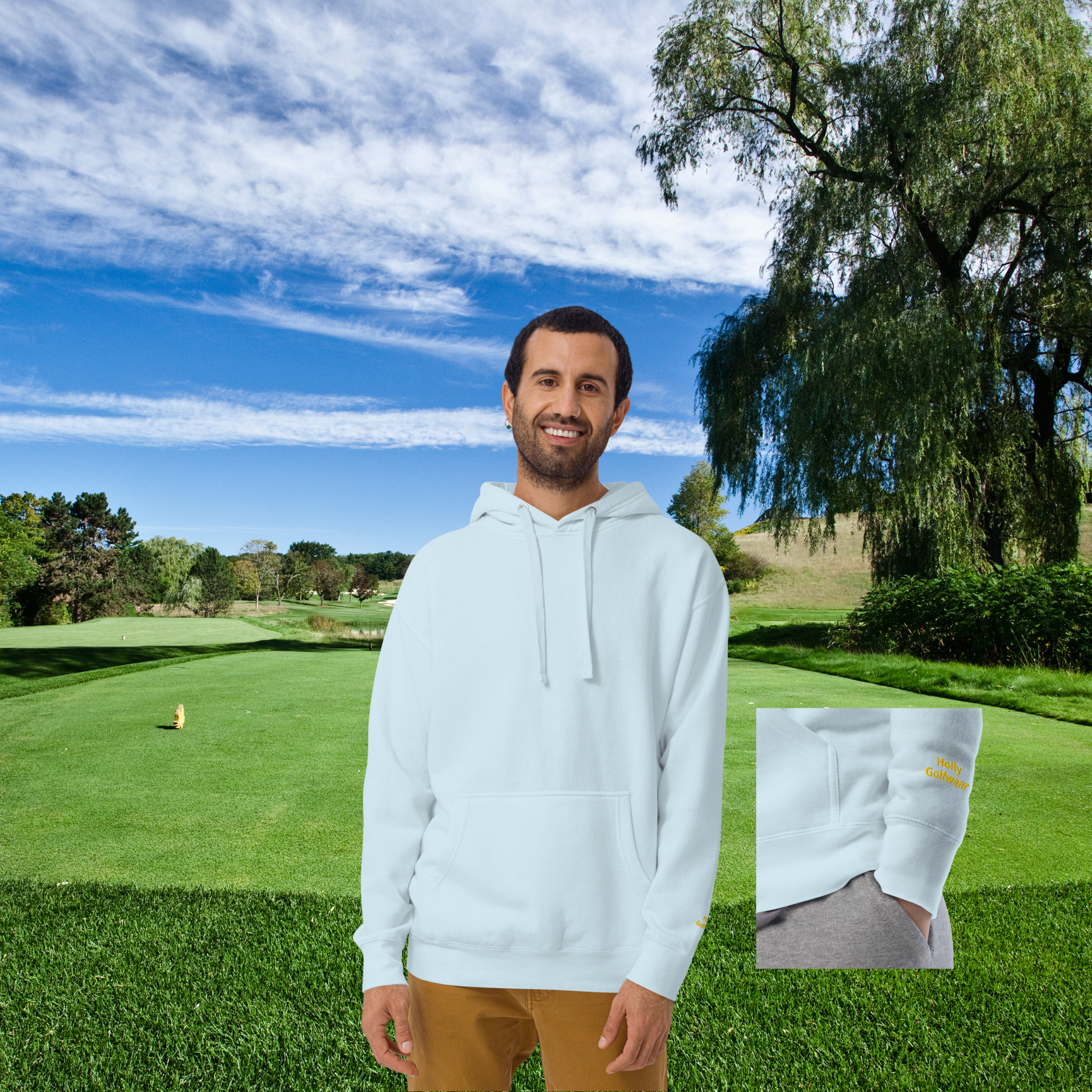 Auf der Rückseite ist das Logo von Holly Golfwear umrandet von dem Spruch "BOGEYS BUILD CHARACTER" gedruckt. Am linken Ärmel findest du den gestickten Schriftzug "Holly Golfwear".